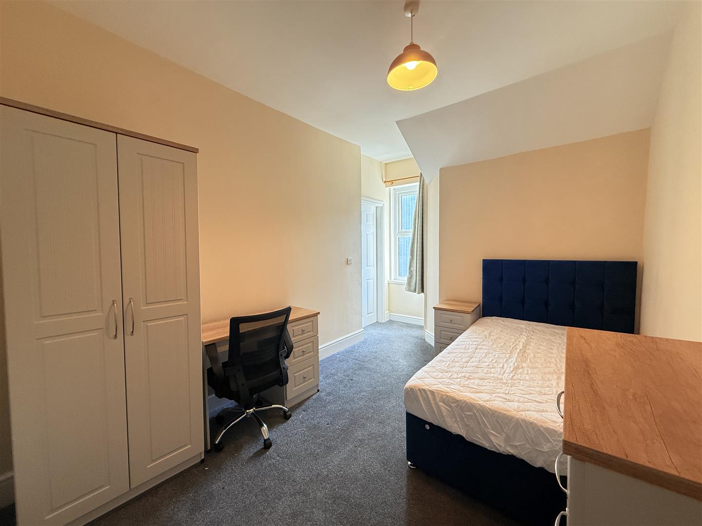Very large and spacious room with great natural light. Two large windows allow plenty of light into the room producing a very nice space. This room comes furnished with a double bed and mattress, a bedside table and a triple wardrobe with shelf and rail storage. There is a desk and chair in the room situated by the window overlooking the front of the property. A pin board has been placed above the desk.