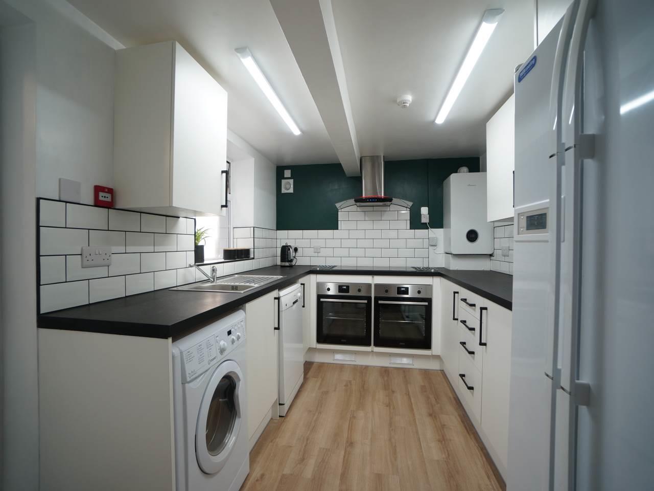 Bright kitchen with a good layout. This kitchen comes equipped with a table and four chairs making it a very good communal room. There is also a sink, oven and hob, large fridge and separate freezer, a washing machine and a kettle. Within this room there is a large amount of available storage in fitted cupboards, there is also plenty of work space.
